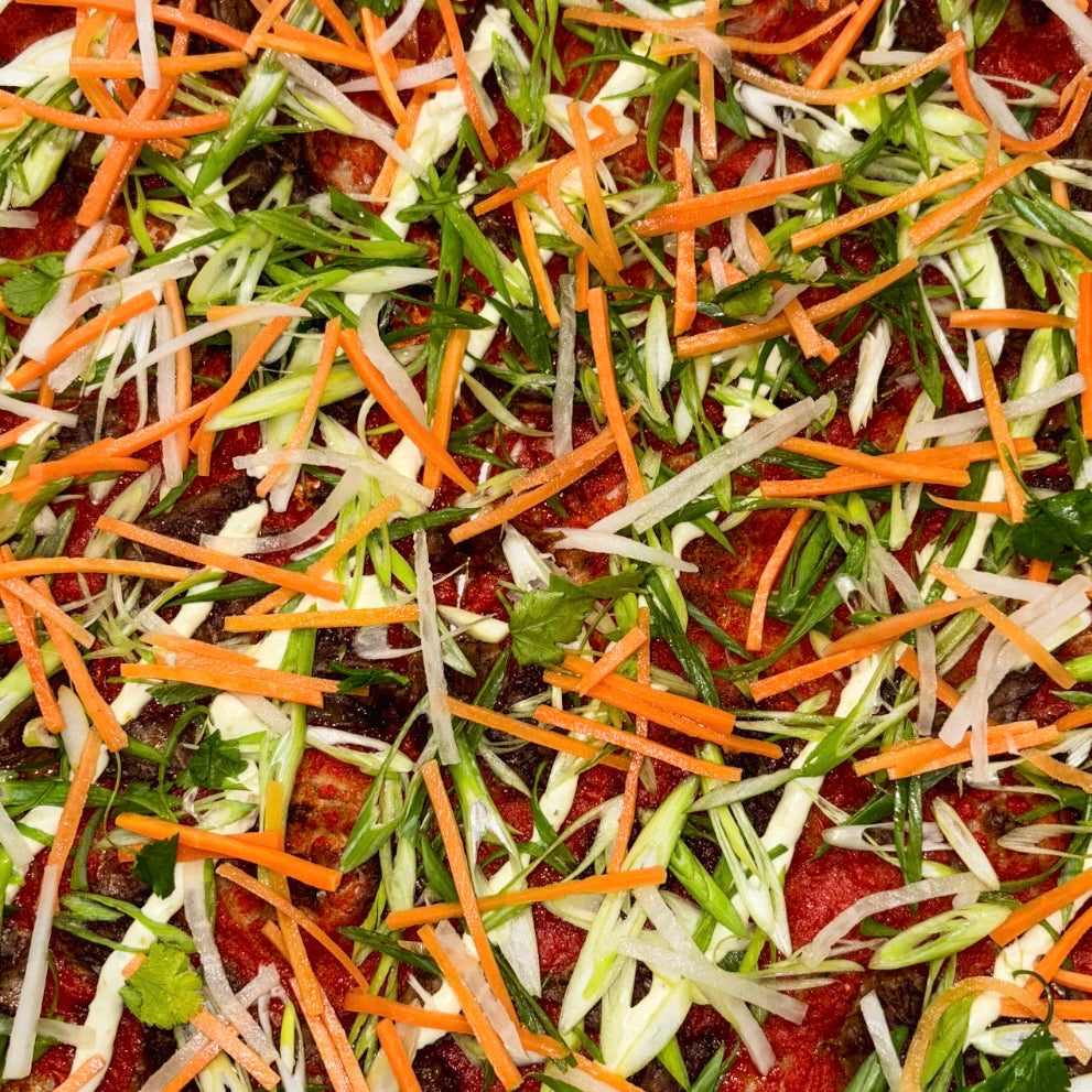 Lil Bros NY Style Tomato Sauce, Vietnamese Marinated Soya Protein (Sons of Butchers), Confit Garlic & Jalapeno Mayo (VG), Pickled Carrot & Daikon, Spring Onion & Fresh Corainder (Fréamh Farm, Co. Galway)